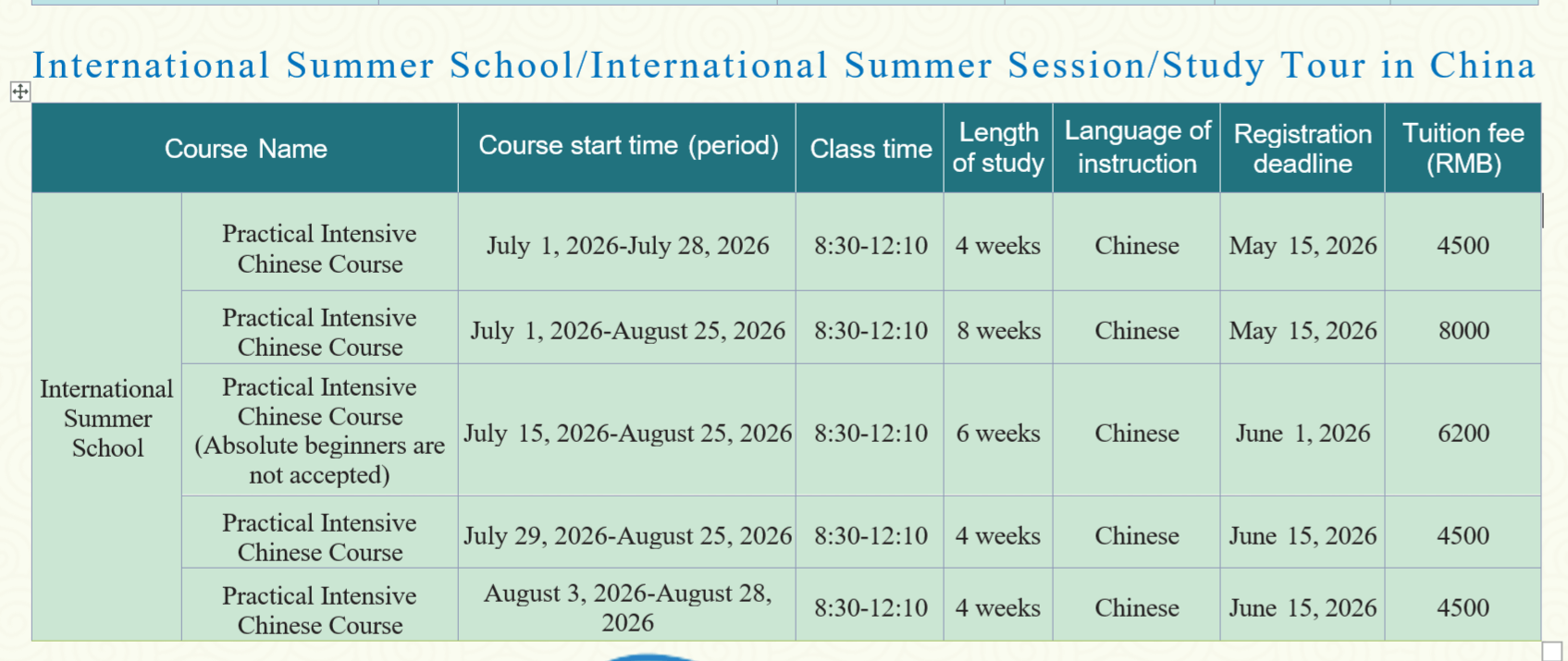 July 15, 2026 – August 25,2026 ค่าเรียน 6,200 หยวน