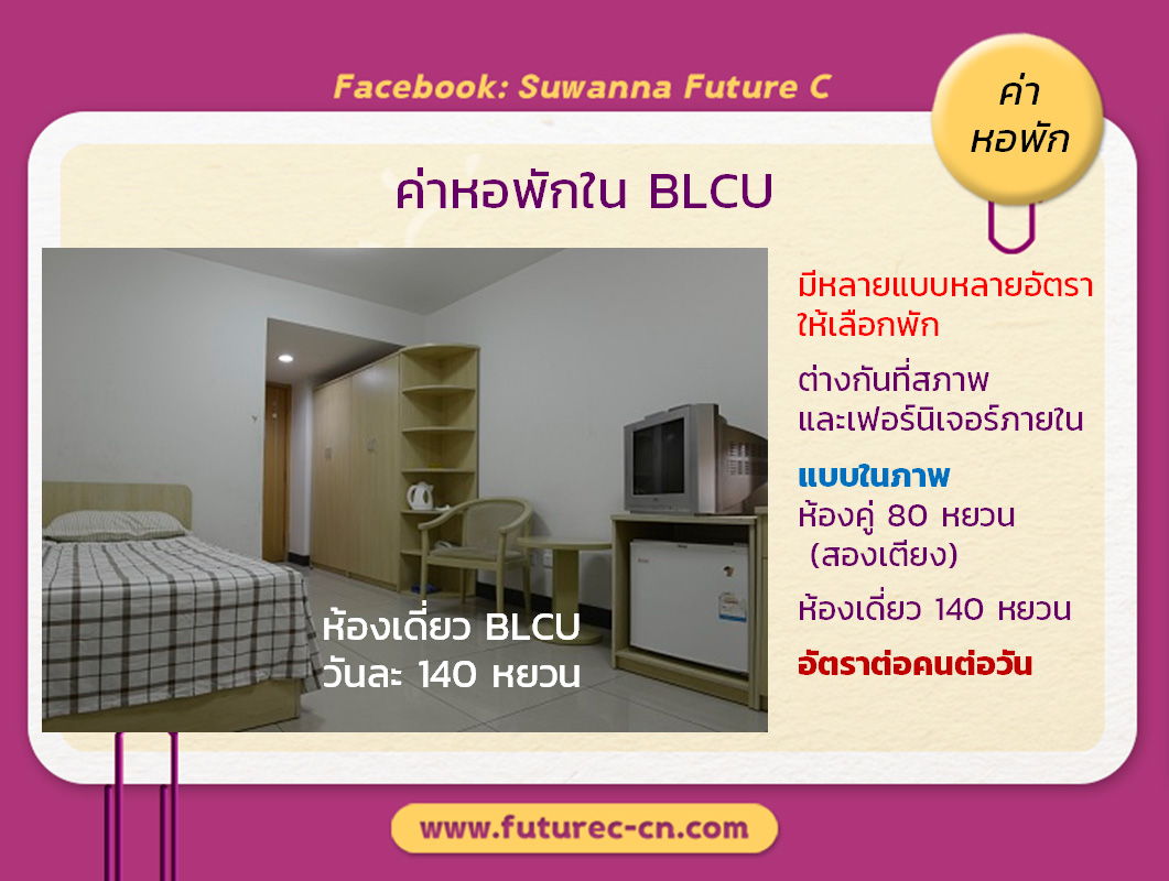ห้องคู่ 120 หยวน/วัน/คน (ประมาณเดือนละ 18,000 บาท/คน ขึ้นอยู่กับอัตราแลกเปลี่ยน)