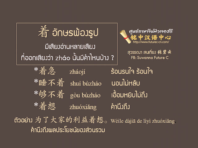 着 ยังออกเสียงว่า zháo zhuó และ zhāo ได้อีกด้วย ตัวอย่างเช่น