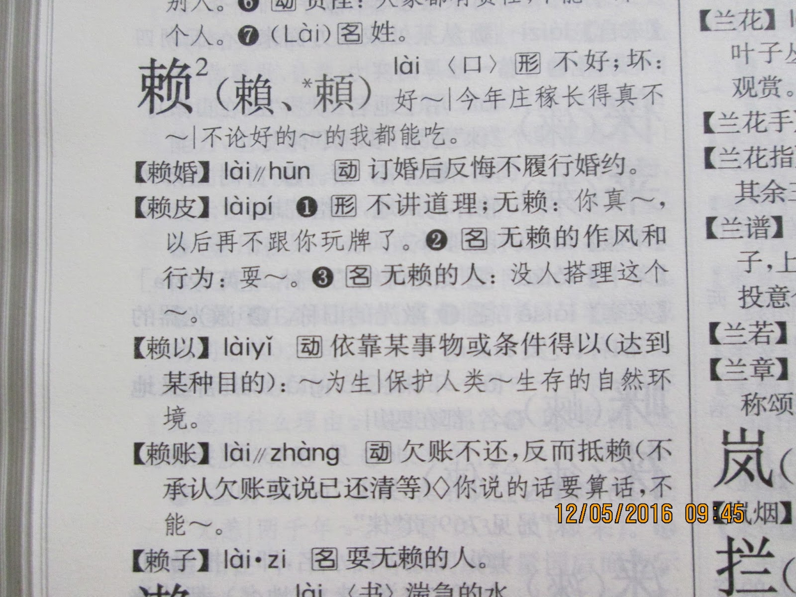 คำว่า 赖 นี้ โดยรากศัพท์เดิมใช้ในเชิงลบ ตัวอย่างคำ เช่น
